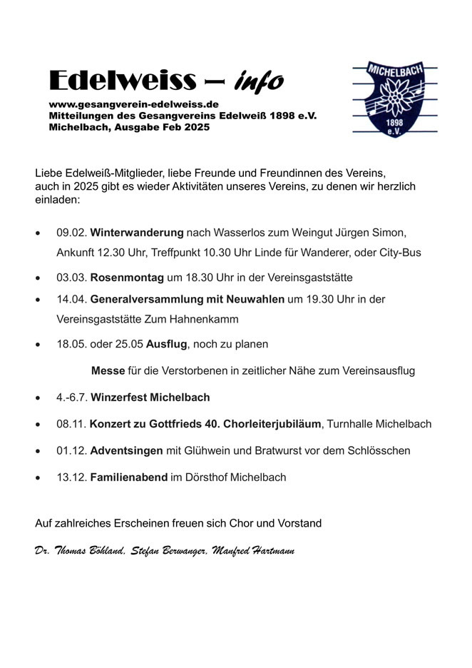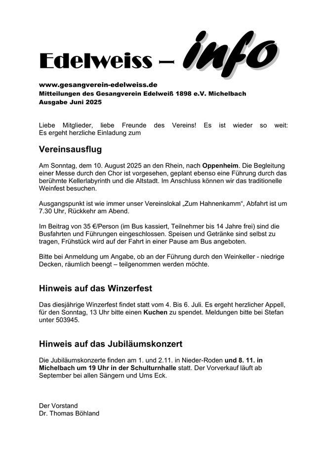 Hier vorab schon mal genannt seien unser Vereinsausflug im Sommer, bei dem gerne auch nicht Vereinsangehörige teilnehmen können,