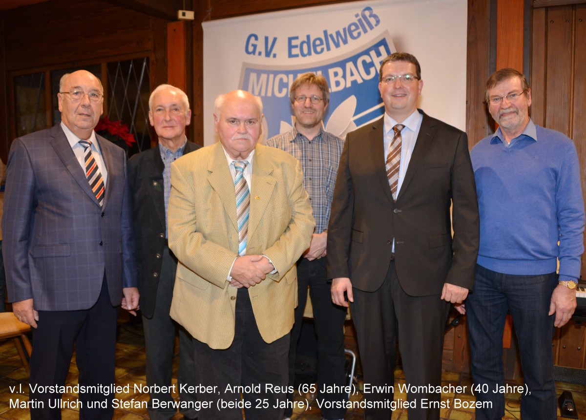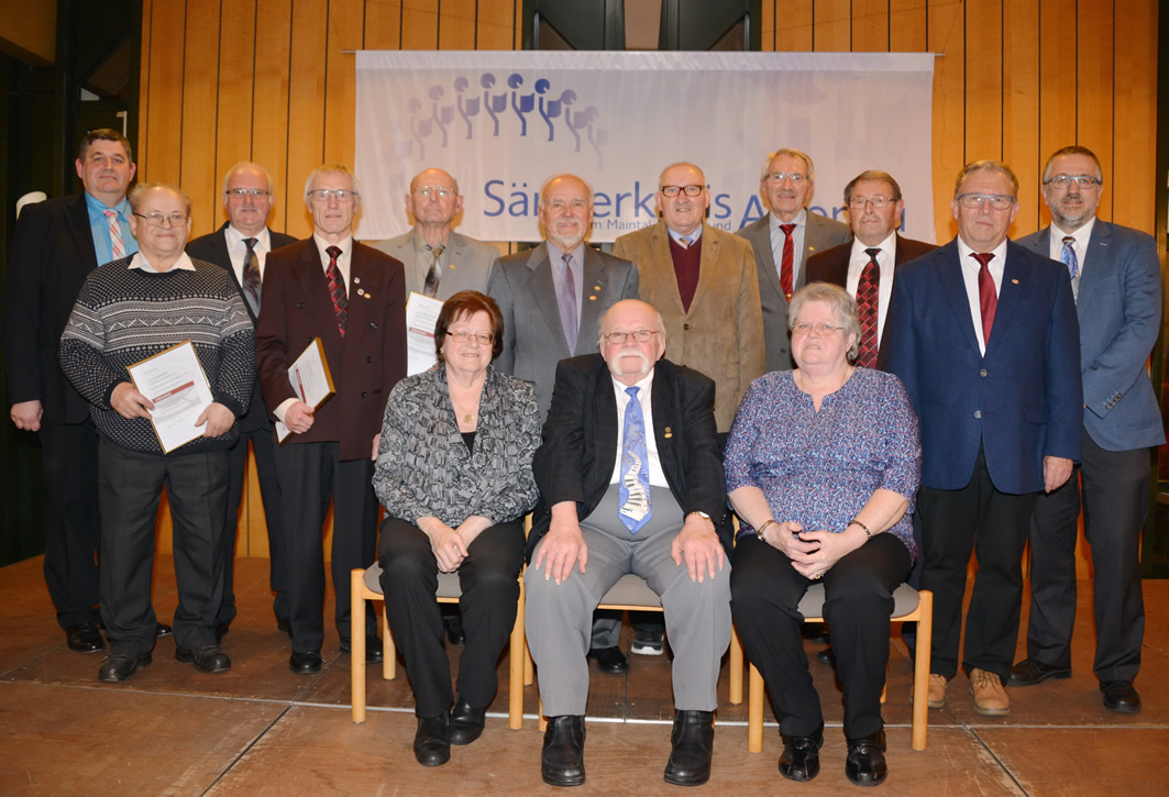 Der Bürgermeister betonte zur Ehrung langjähriger Mitglieder, wer 50 und mehr Jahre seinem Verein die Treue halte, fühle sich dort sicherlich wohl. Mit Ehrenurkunden wurden Reinhard Trageser (50 Jahre), Georg Beck, Engelbert Pfeifer, Werner Wilz, Leonhard Ullrich (alle 60 Jahre) und Peter Bauer (65 Jahre) vom Vorstandsmitglied Ernst Bozem und von Norbert Kerber ausgezeichnet. Die Aktiven Georg Beck (60 Jahre) und Otto Hartmann (40 Jahre) waren vor kurzem beim Ehrenabend des Sängerkreises Alzenau mit Urkunden des Deutschen Sängerbundes geehrt worden.