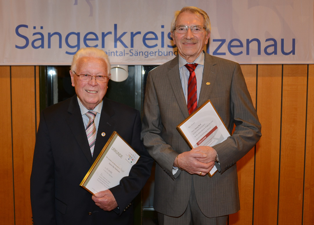 Georg Beck singt seit 60 Jahren und Otto Hartmann singt 40 Jahre im Edelweiß. Zu diesen Jubiläen entbot der Maintal-Sängerbund 1858 e. V., vertreten durch den Sängerkreis Alzenau, den beiden Sängern herzliche Glückwünsche und verlieh ihnen für den langjährigen Gesang in einem Chor die Ehrennadel in Gold. Er sprach seine Anerkennung aus dankte ihnen für vorbildliche Treue im Chorgesang. |