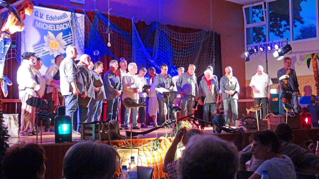 Unter dem Motto „Anker auf und Leinen los“ bot der Gesangverein Edelweiß am Samstag, dem 09. Juni 2018 in der Schulturnhalle Michelbach ein Konzert zum 120-jährigen Jubiläum des Vereins dar. Mottogerecht war die Turnhalle mit Fischernetzen, Rettungsringen, Signallichtern und einem Schiffsbug samt Meerjungfrau prächtig dekoriert.